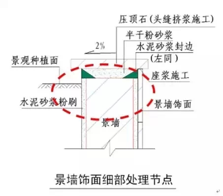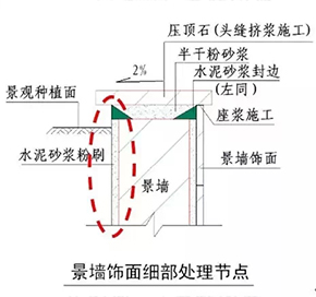 (1)景墻內側未做防水,雨水從灰縫中流到景墻正面形成泛堿流掛污染現象。