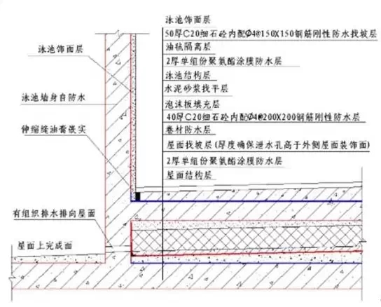 (2)游泳池壓頂施工不符合要求,產生泛堿現象。