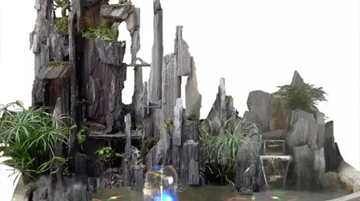最適宜表現(xiàn)大江和江河駁岸及散點石造景。制作龜紋石盆景時,要依紋配山,散點石及山足石可用切割